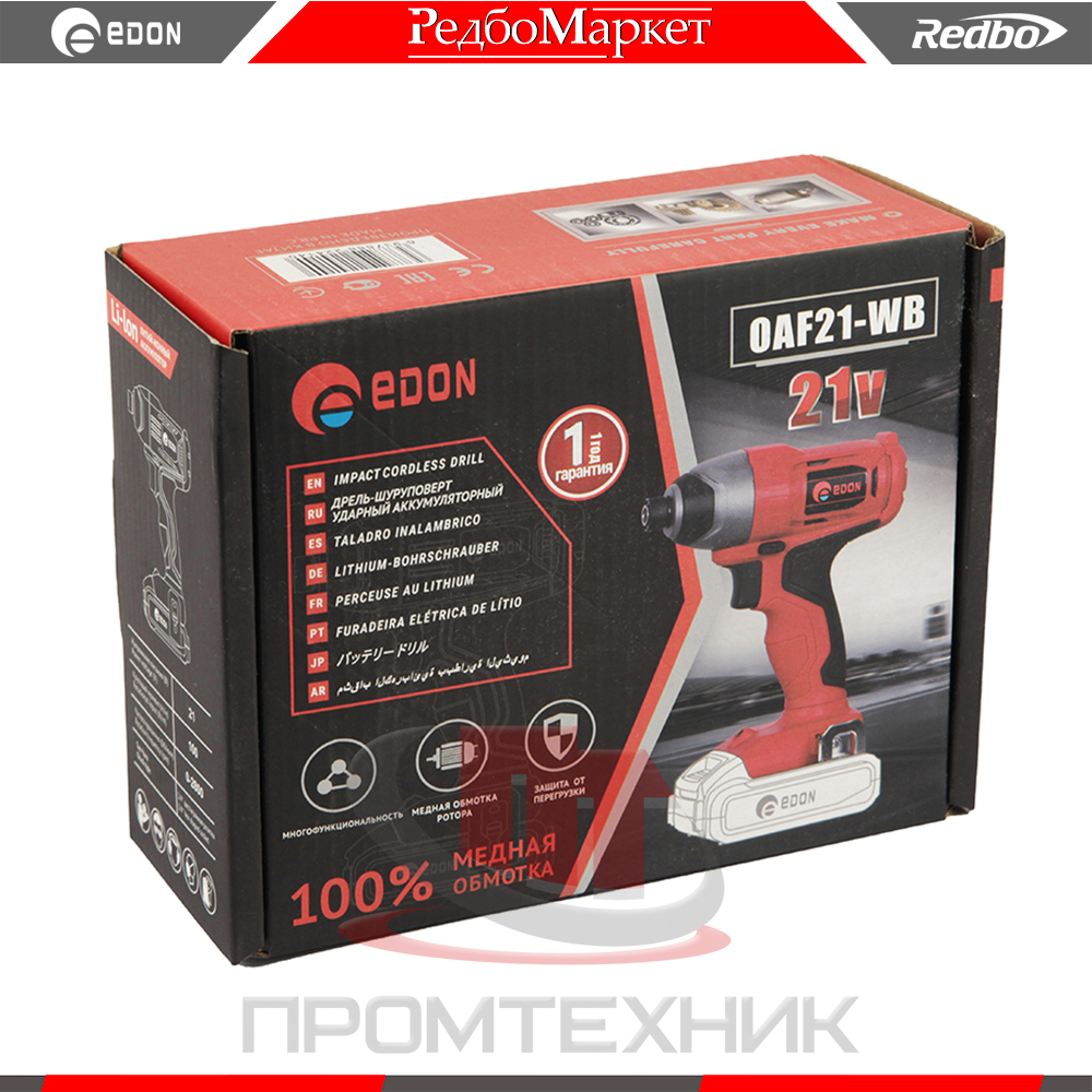 Винтоверт аккумуляторный безударный Edon OAF21-WB, предназначена для закручивания, отворачивания болтов, гаек, винтов и шурупов, сверления отверстий в различных конструкционных материалах (в том числе металле, дереве, пластмассе и т.п.)