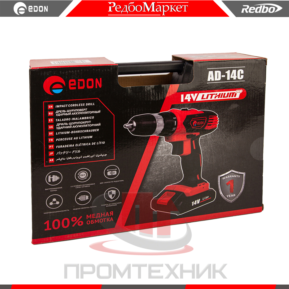 Дрель-шуруповерт аккумуляторная безударная Edon AD-14С, предназначена для закручивания, отворачивания винтов и шурупов, сверления отверстий в различных конструкционных материалах (в том числе металле, дереве, пластмассе и т.д.).