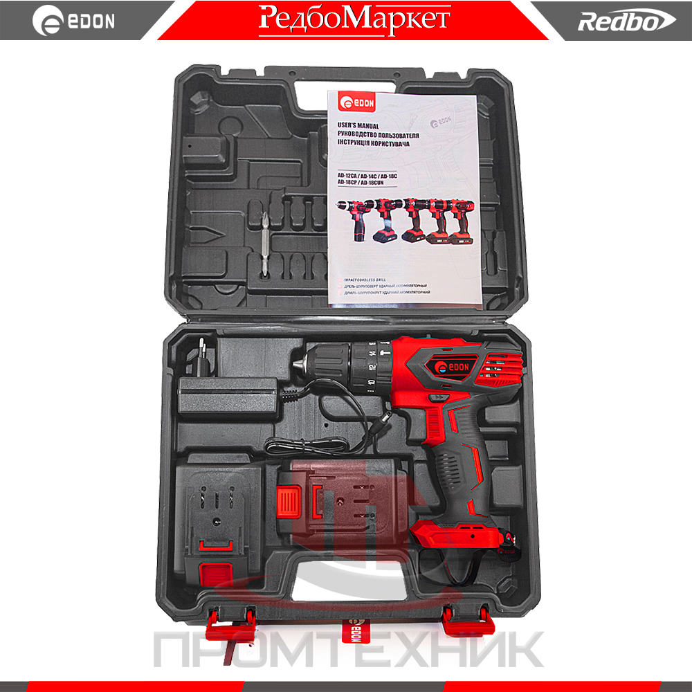 Дрель-шуруповерт аккумуляторная ударная Edon AD-18CP, предназначена для закручивания, отворачивания винтов и шурупов, сверления отверстий в различных конструкционных материалах, имеет функцию удара и соответственно возможность сверления в бетоне, кирпиче, пено-блоке и других строительных материалах.