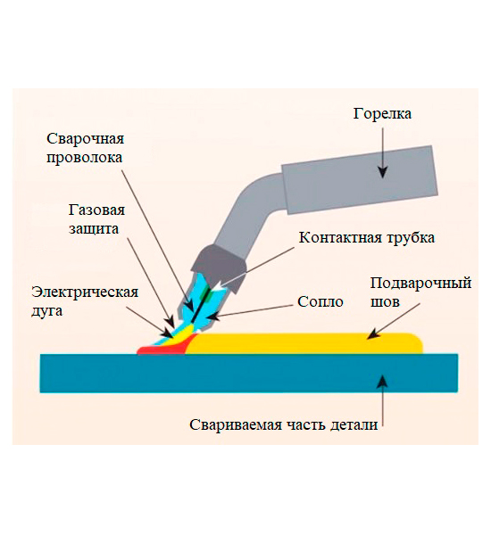 Как дуга, так и сварочная ванна защищены от атмосферного загрязнения экраном из инертного (в случае MAG) или нереактивного (в случае MIG) газа.