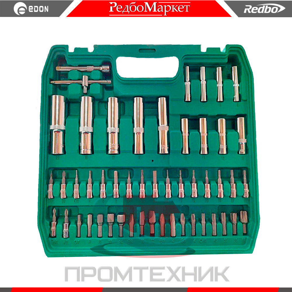 - 1/2": головки торцевые (10-24,27,30,32 мм.), головки торцевые длинные (14,15,17,19,22 мм.), Е головки торкс (10,11,12,14,16,18,20,24 мм.), 255мм ключ трещоточный с быстрым сбросом, 120 мм. удлинитель, 250 мм. битодержатель, 16 мм. головка свечная, 21 мм. головка свечная, карданный шарнир, 8 мм. битодержатель;